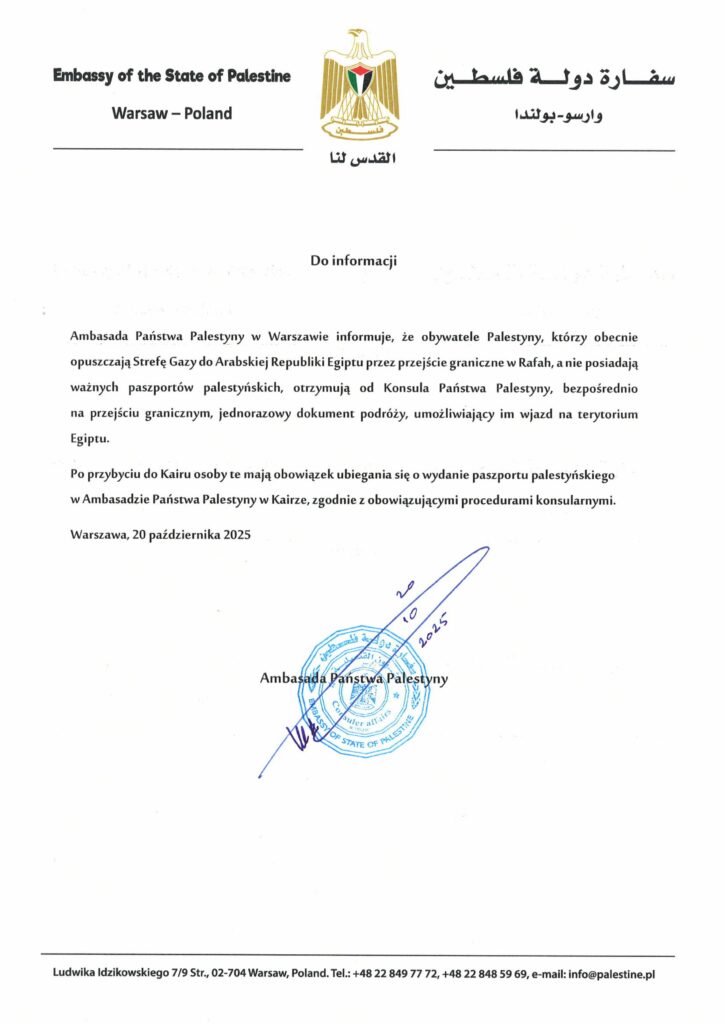 Ambasada Państwa Palestyny w Warszawie informuje, że obywatele Palestyny, którzy obecnie opuszczają Strefę Gazy do Arabskiej Republiki Egiptu przez przejście graniczne w Rafah, a nie posiadają ważnych paszportów palestyńskich, otrzymują od Konsula Państwa Palestyny, bezpośrednio na przejściu granicznym, jednorazowy dokument podróży, umożliwiający im wjazd na terytorium Egiptu. Po przybyciu do Kairu osoby te mają obowiązek …