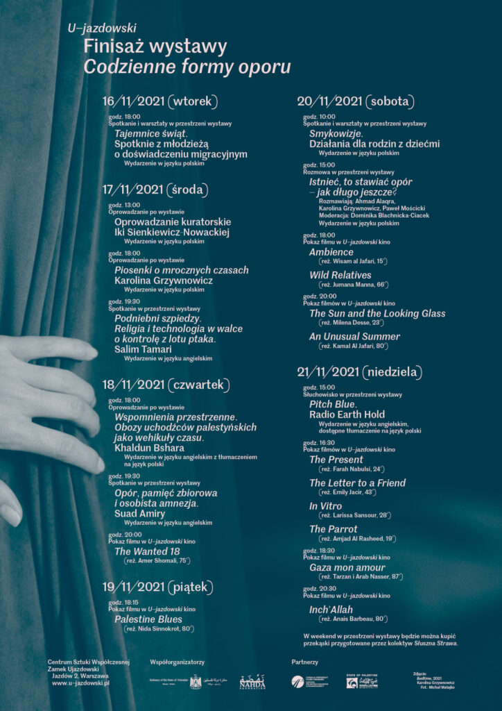 Wystawa „Codzienne formy oporu” zakończyła się przeglądem filmów palestyńskich. W czwartek, 18 listopada, w Centrum Sztuki Współczesnej Zamek Ujazdowski w Warszawie odbyła się uroczystość z udziałem przedstawicieli Ministerstwa Spraw Zagranicznych, parlamentarzystów polskich oraz arabskich i zagranicznych członków korpusu dyplomatycznego w Polsce. Wydarzenie powstało w wyniku współpracy: Ambasady Państwa Palestyny, Centrum Sztuki Współczesnej Zamek Ujazdowski, Fundacja …