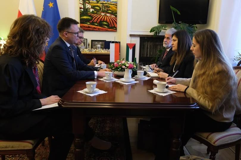 J.E. Minister Spraw Zagranicznych i Ekspatriantów Palestyny, JE dr Varsin Aghabekian Shahin spotkała się dziś rano w siedzibie polskiego parlamentu z Wicemarszałkiem Sejmu, JE Panem Szymonem Hołownią. W rozmowach uczestniczyli również Ambasador Państwa Palestyny w Polsce JE Pan Mahmoud Khalifa oraz Trzeci Sekretarz, Pani Sara Zaghari.